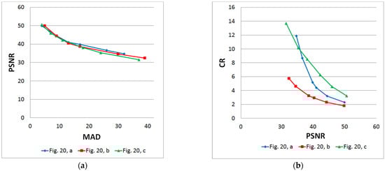 Figure 21a shows almost the same behavior of dependence of PSNR on MAD for all three images. This means that the dependence of PSNR on MAD depends on image content only slightly. In contrast, compression efficiency measured by CR significantly depends on the image content. For instance, the test image shown in