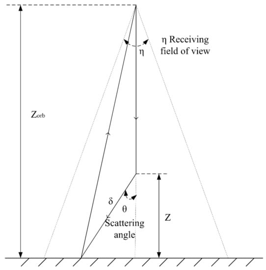 As shown in Figure 2, δ is the distance from a photon to the ground through atmospheric scattering, Z is the distance from a photon to the ground without atmospheric scattering, θ is the scattering angle, η is the receiving field angle, and Zorb is the satellite orbital height. In addition, the equation is closely related to temperature, pressure, atmospheric molecular density, and other factors, which simplifies the related description to a considerable extent.