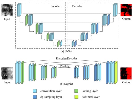 Previous studies [,,] have realized cloud detection in footprint images based on SegNet and U-Net. As shown in Figure 3a, U-Net is a U-shaped network that is improved based on fully convolutional networks (FCNs). In the encoding and corresponding decoding steps, the feature images obtained by deconvolution are superimposed to obtain finer cloud contour data. However, they are accompanied by sawtooth contour noise. As shown in Figure 3b, SegNet is a symmetrical structure that, compared to FCN, improves the mapping method of the deconvolution layer and improves the spatial continuity of cloud features. However, there is a degree of false detection at the edges of the detection area. To combine the advantages of the two network structures and improve the overall accuracy, we adopted the boosting method for model ensemble generation in training [] and test time augmentation (TTA) technology in post-processing []. Boosting refers to iteratively training the base model (SegNet, U-Net) and adjusting the weight ratio according to the incorrect classification results of the previous round until the training accuracies converge. The purpose of TTA technology is to enhance the typical features of the image to be detected by rotating and stretching the color mapping range without changing the model itself, thereby improving the identification accuracy.