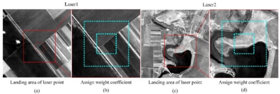 Only clouds distributed along the laser transmission path will cause errors, and the closer the cloud is located to the laser landing point, the greater the impact. Therefore, further optimization was carried out using the proposed method. The LFI records the position of the laser spot at the exit time. The position of the laser spot on the LFI can be deduced using the rational polynomial coefficient (RPC) model. Figure 4a,c exhibit the landing positions of beams 1 and 2 on the LFI, respectively, which are indicated by red dotted circles. Cloud detection was performed using 256 × 256 slices formed by expanding the predicted center position of the laser foot point by 128 pixels. The slicing range of laser beam 1 in the LFI is [line: 150–406, column: 78–334], as displayed in Figure 4b. The slicing range of laser beam 2 in the LFI is [line: 112–368, column: 147–403], as displayed in Figure 4d. However, the closer the cloud is to the center of the spot, the greater the scattering influence on the laser. Therefore, weight coefficients of 1.5, 1, and 0.5 cloud amounts were assigned to slice positions 64, 128, and 256 to quantify the influence of cloud scattering on the laser, as shown in Figure 4b,d. If the cloud amount in the slice image was greater than 30%, the slice was judged to be affected by clouds. However, if the cloud amount was less than or equal to 30%, the slice was ascertained to be unaffected by clouds.