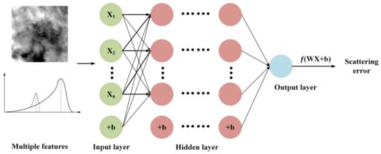 For a sample set with n features, the feature vector is X = [x1, x2,…xn]. There are m neurons in the hidden layer. The weight vector matrix between the input layer and the hidden layer is initialized as wmn, and the corresponding biased error is bm. The weight vector between the hidden and output layers is Wi = [w11,…wmn]. This constitutes a new input for the subsequent layer, as displayed in Equation (7).