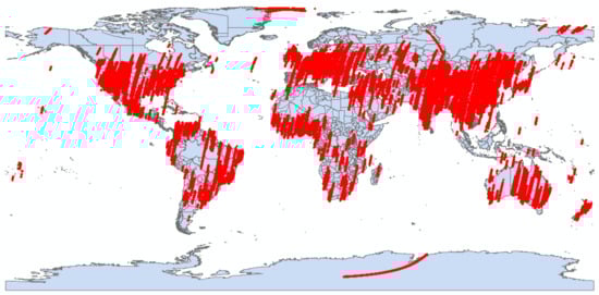 The GF-7 satellite was successfully launched on 3 November 2019, and the first orbital laser data were obtained on 5 November 2019. By March 2021, 3.56 million laser points had been obtained, of which 1.57 million were in China. The global distribution of laser point trajectories is displayed in Figure 6. The observation area was concentrated in Asia, and the number of laser points in polar regions was low.