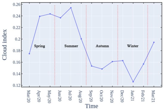 As shown in Table 4, cloud scattering influenced 18.47% of the data. As nearly 40% of the data were distributed in China, according to a quarterly classification standard of East Asia, we observed obvious seasonal changes, as displayed in Figure 7. The cloud index refers to the amount of cloud on LFI based on the method described in Section 2.2. The proportion of laser data points affected by cloud scattering during these seasons was above 30%. However, there is less cloud cover during the autumn and winter, and the proportion of laser data points affected by cloud scattering was less than 17% during these seasons. The space–time variation law of cloud cover is important for analyzing the influences of cloud scattering, planning satellite schedules, and determining the number of laser launches [].
