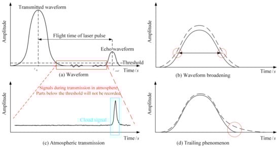 Influences of atmospheric scattering on laser altimetry data. (a) shows the transmitting waveform and receiving waveform of GF-7 laser system; (b) shows the waveform broadening caused by atmospheric scattering;(c) shows the process of capturing cloud signals by laser altimetry system, but GF-7 does not have this ability; (d) shows the tailing phenomenon caused by atmospheric scattering.