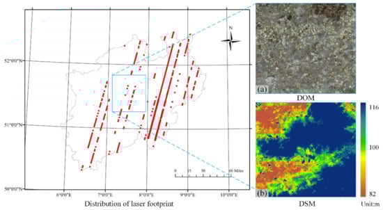 Regional distributions of laser data and verification data in North Rhine-Westphalia, Germany. (a) is DOM data obtained by aerial photography in the experiment area; (b) is DSM data for LIDAR points cloud acquired in the same period.