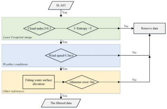 Figure 12 shows a flow chart for atmospheric scattering identification in water areas, which differs from the screening strategy used for land areas. The characteristic parameters of LFI were used to determine whether clouds, aerosols, or other atmospheric particles were present along the laser transmission path. Characteristic meteorological parameters were used to determine whether wind waves were present on the lake surface, which could affect the consistency of the elevation data along the track. Other reference characteristics were closely related to the validation scheme. Meteorological data, including wind speed and rainfall, were obtained from hydrological stations near the lakes. For the GF-7 satellite, it is almost impossible to obtain underwater laser spots owing to the laser wavelength and emission energy []. When no wind or waves are present, the elevation of the inland lake area exhibits good consistency, and the average elevation of the lake surface can be used as the true value to estimate the height deviations of each laser point. When the spatial range of the lake is too large, the influence of the Earth’s curvature should be considered in the elevation changes along the track, for which there is a clear overall trend. Therefore, we fitted the water surface trend and used the fitted elevation value as the true value to calculate the corresponding altimeter errors. After a series of steps, we determined that 47 laser points were affected by atmospheric scattering in the study area, accounting for ~40.87% of the total. The height deviations ranged from 0.01 m to 1.1 m.
