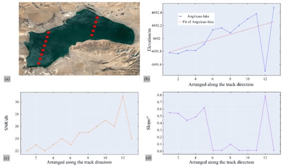Analysis of the atmospheric scattering effect in the Angzicuo Lake area. (a) is the GF-7 satellite image and laser track in the angzicuo lake; (b) is the elevation change of laser along the track direction; (c) shows the change of SNR of waveform corresponding to laser data; (d) shows the slope change corresponding to the laser data.