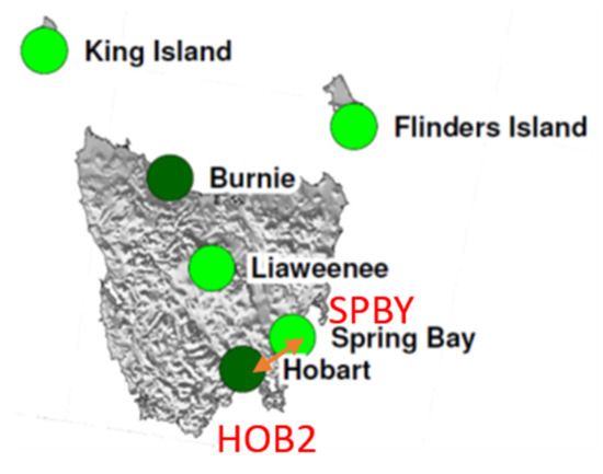 Reference stations of HOB2 and SPBY. (https://www.ga.gov.au/scientific-topics/positioning-navigation/geodesy/gnss-networks/station-coordinates-and-maps, accessed on 1 October 2021).