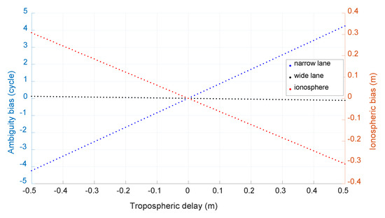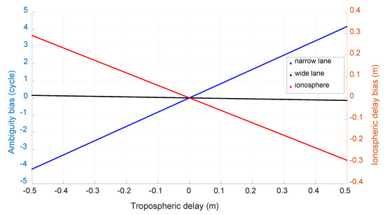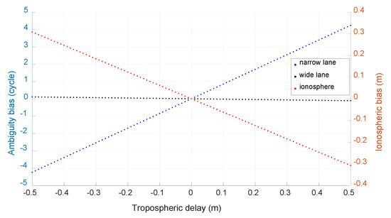 Notice that in the above equations, the tropospheric delay is also ignored and its effect on ambiguity resolution is also investigated with the method same to the above section for BDS case. Figure 12 shows the size of the caused bias with a simulated tropospheric error from −0.5 m to 0.5 m and the unit of the bias of narrow-lane and wide-lane ambiguity is cycle. We can see that the biggest bias of wide-lane ambiguity is only about 0.12 cycle with a tropospheric error of 0.5 m. With a tropospheric error of several cm as shown in Figure 4, its effect on wide-lane ambiguity resolution can be neglected.
