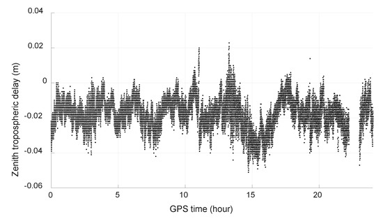 Figure 3 shows the size of the bias with a simulated tropospheric error from −0.5 m to 0.5 m. The unit of the bias of narrow-lane and wide-lane ambiguity is cycle and the unit of the bias of estimated ionospheric delay is meter. We can see that the biggest bias of wide-lane ambiguity is only about 0.11 cycle with a tropospheric error of 0.5 m. As the remaining tropospheric error is generally no more than 10 cm for medium-distance baseline after being corrected with popular models and double-differenced between stations and satellites, its effect on wide-lane ambiguity resolution can be neglected. Figure 4 is the estimated remaining zenith tropospheric delay of baseline HOB2-SPBY with ambiguities fixed. Though the estimated value is not stable due to observation noise and the effect of multipath, we can see that it should be about, or no more than, 2 cm.