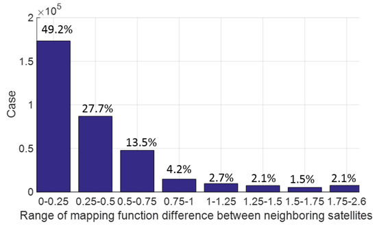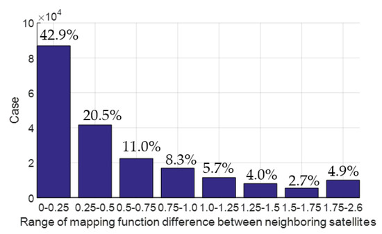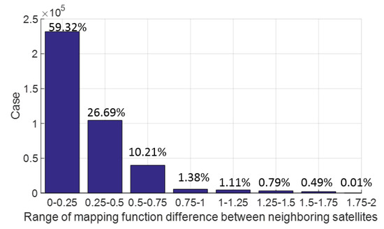In order to reduce the effect of tropospheric error on narrow-lane ambiguity resolution, a new differencing scheme between satellites is proposed in which differencing is formed between satellites with closest tropospheric mapping functions. Figure 7 shows the statistics of the mapping function range after differencing between BDS satellites with closest mapping functions and we can see that more than 50% are within 0.25 and about 96% within 1.0. This means that with a zenith tropospheric error of 2 cm, more than half of remaining tropospheric errors, after differencing between satellites, will be within 5 mm and the caused bias of narrow-lane ambiguity resolution will be within 0.046 cycle; and about 96% will be within 2 cm and the caused bias of narrow-lane ambiguity resolution will be within 0.185 cycle.