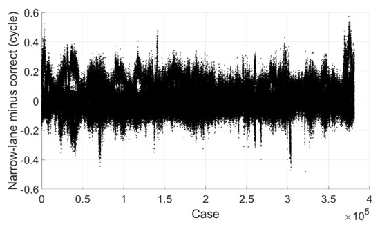 Narrow-lane ambiguity minus correct integer ambiguity (GPS).