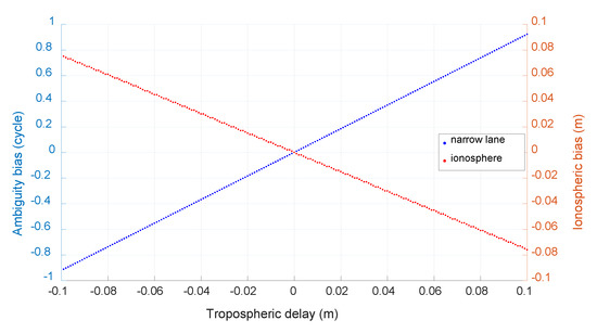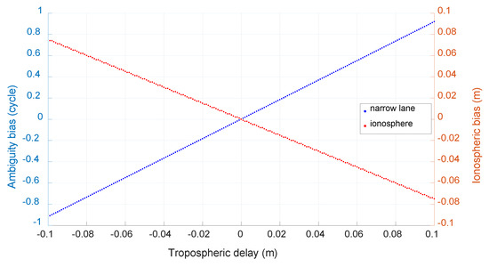 Note that tropospheric delay is also ignored and its effect on ambiguity resolution is investigated with the same method to BDS case and shown in Figure 14. We can see that the effect is similar to that of BDS and also obvious, the bias of narrow-lane ambiguity can reach 0.922 cycle with tropospheric error of 0.1 m and 0.184 cycle with tropospheric error of 2 cm.