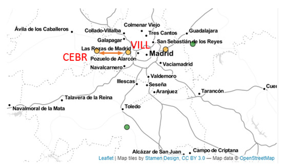 The reference stations of CEBR and VILL. (https://www.epncb.oma.be/_networkdata/stationmaps.php, accessed on 1 October 2021).