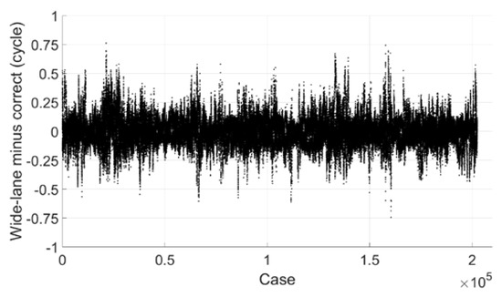 Figure 5 shows the estimated wide-lane ambiguity minus correct integer ambiguity, and we can see that most of them are within 0.2 cycle and all are within 0.6 cycle. If the threshold value is set to 0.25 cycle, 99.9% of epochs can be fixed successfully, and there is no mis-fixed case.
