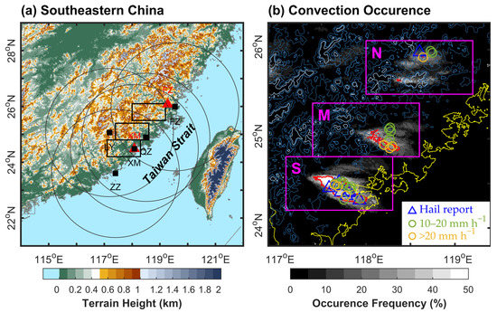 The southeastern coast of China (Figure 1a), located to the west of the Taiwan Strait, is an ideal region for investigating the complexity of convective development on small scales due to its extremely complex underlying surfaces mainly distinguished by wide coastal mountains at multiple altitudes. Convective development in this region can be also complicated by the interaction between midlatitude and subtropical weather systems, especially during the transition between cold and warm seasons. Previous climatology studies have suggested that this region has been suffering a lot from severe convective weather (e.g., lightning; [35]), just as many other coastal regions in China with dense population do, and thunderstorm activities have been significantly increasing in this region [36]. However, studies of detailed convective characteristics, by well exploiting high-resolution observations, have been lacking in this complex region compared to other convection-active and densely-populated areas of coastal China (the southern coast of China is maybe the most studied one, e.g., [37,38]). Furthermore, observational evidence on the linkage between early-stage convective development and subsequent storm severity is insufficient in the southeastern coast of China, which has a subtropical climate regime. These issues largely motivated this study.
