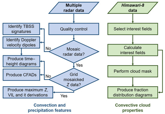 In this study, comparisons were evaluated by jointly using observations from the region’s surveillance radar network and the Himawari-8 geostationary satellite from the perspectives of both precipitation and cloud. For complete comparisons, we explored the usage of all the three base moments (i.e., Z, Vr, and W) from the radar network observations. In particular, a new quantity derived from three-dimensional Z data is proposed to estimate the weak-echo region signature in convective storms. Multispectral interest fields derived from Himawari-8, a state-of-the-art geostationary satellite [40], were considered to cover the various cloud properties including cloud-top height, cloud optical thickness, cloud-top glaciation, particle size, and updraft strength. The combined utilization of radar- and satellite-based signatures to examine the convective initiation and growth processes in the southeastern coast of China could serve as a supplement to the limited number of relevant studies in the U.S. [24] and equatorial Africa [41].