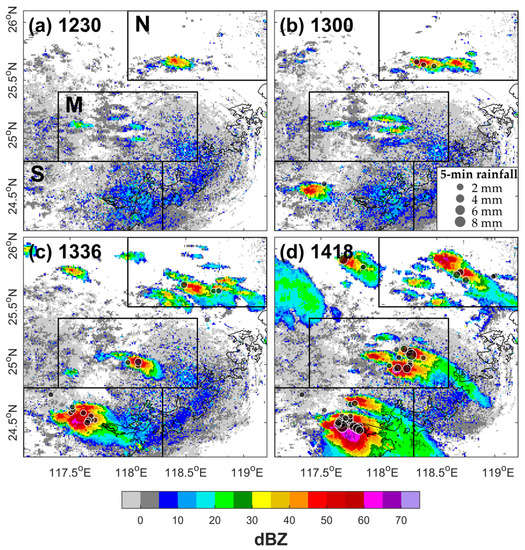 Maximum radar reflectivity images with in situ 5 min rainfall (black dots) at (a) 1230, (b) 1300, (c) 1336, and (d) 1418 LST on 6 May 2020. Three convection-active zones are indicated by the black boxes.