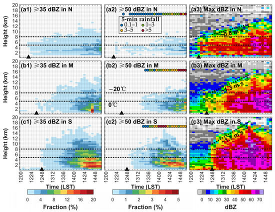 After initiation, the ≥50 dBZ strong convective precipitation (SCP) appeared immediately (within ~6 min) in N and S, but it did not appear in M until ~42 min later (Figure 7a2–c2). Mainly occurring below the freezing level, the initial convection in M before 1318 LST was too shallow to produce SCP (Figure 7b1,b2). For N, the initial convection happening in a relatively moist environment (Figure 3c–e and Figure 4a) was dominated by warm-rain processes, with most SCP below the freezing level until ~1400 LST (Figure 7a2). The initial convection in S exhibited most explosive development once the relatively strong CIN (Figure 5a) was overcome, with the production of SCP extending into the −20 °C levels within 30 min from the convective initiation time (Figure 7c2). As seen in the CFADs, a rapid decrease in maximum Z with height from the freezing level upward was observed in the initial convection in N and M (refer to the outmost curves in Figure 8a1,a2,b2), again suggesting dominant warm-rain processes within weak updrafts [24,47]. In contrast, the deepest initial convection in S had a larger maximum Z within the mixed-phase layer (freezing to −20 °C levels) than other levels (Figure 8c2).