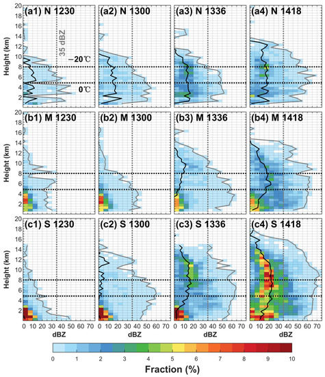 As convection grew in all zones, there was a tendency toward more dominant ice-phase processes (e.g., riming) to facilitate hail production, with an enhanced maximum frequency core (nearby the mean Z profile) above the freezing level (Figure 8). This was particularly true for S, where more large Z values appeared above the −20 °C level (Figure 8c3,c4). A negative slope of the core from ~11 to near 17 km in S at 1418 LST (refer to the black curve in Figure 8c4) indicates the presence of a large amount of small ice particles at the convective cloud tops [24], which was less apparent in other zones (Figure 8a4,b4). This may have been related to the fast occurrence and expansion of deep convective cloud anvils in S favored by the relatively large vertical wind shear (Figure 5a), and it is further discussed in the forthcoming analysis based on Himawari-8 interest fields.
