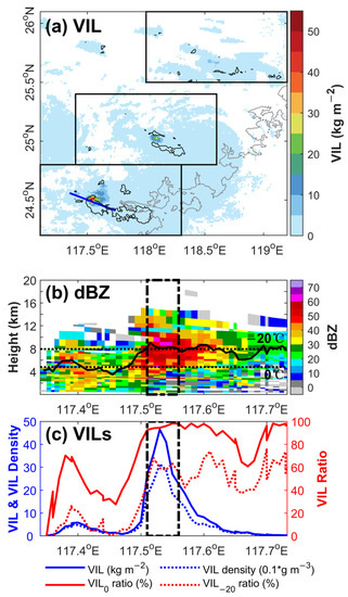More realistic vertical structures of convection can be explored from the VIL and its derivations. The VIL integrates Z throughout a whole vertical column and is thus more capable of distinguishing different components of convective systems relative to the maximum Z (see Figure 9a versus Figure 6c). Figure 9 shows an example at 1336 LST across a lofted deep convective core in S with a weak-echo region (WER) at low levels. WERs are associated with wide and strong updrafts and have been long recognized as indicators of severe storms (e.g., [14]). It was observed that the WER was located in columns where the VIL and its density were extremely high, the ratios of the VIL above the freezing and −20 °C levels were reasonably large, and the equivalent altitude (VIL-weighted altitude) was near the −20 °C level (dashed box in Figure 9b,c). For subsequent comparison, the WER was defined as the region with a VIL greater than 20 kg m−2 and a VIL ratio above the freezing level of more than 75%. This newly-defined WER quantity demonstrates a way to quantify the visibility of WER signatures by considering the vertical distribution of convective echoes within a storm.