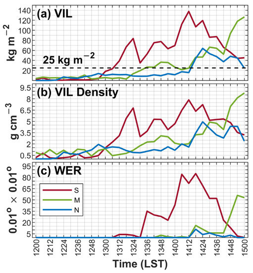 There was a growing trend for the maximum VIL in each zone (Figure 10a), indicating enhanced convective depth and intensity. A maximum VIL larger than 25 kg m−2, which is a typical threshold used to indicate hail production (e.g., [49]), was achieved in S first from 1312 LST, followed by M from 1336 LST and N from 1418 LST. There were two clear, sharp growths in S, with ~80 kg m−2 increments during 1254–1324 LST and 1354–1412 LST. The growth was relatively steady in M, with an ~130 kg m−2 increment from 1318 to 1500 LST, and much slower in N, especially before 1412 LST. Similar results could be observed in the maximum VIL density (Figure 10b), except with smaller variations due to the normalization by the echo top. Notably, two peak values in S (at 1324 and 1412 LST) were more comparable in maximum VIL density (~7 and ~8 g cm−3, respectively) than in maximum VIL (~80 and ~140 kg m−2, respectively). This implies that the second growth in maximum VIL could have been largely contributed by the growth in convective echo top, as confirmed by Figure 7c3. The WER appeared earlier and had a larger area in S than in M and N over most of the period (Figure 10c). These features again demonstrate overall stronger updrafts from N to S.
