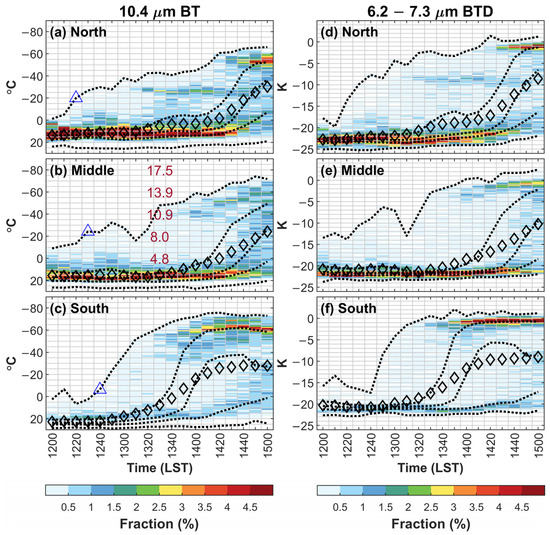 The above cloud-top height results are supported by the BT difference (BTD) between 6.2 and 7.3 μm, which estimates the cloud-top height relative to the upper troposphere [55]. As clouds developed into the upper troposphere, BTD6.2−7.3 became less negative, and it approached and even exceeded 0 K. From 1240 LST onward, the maximum BTD6.2−7.3 in S quickly increased from a magnitude less than −17 K and became positive at 1330 LST (Figure 12f), signifying that the cloud had developed into the upper troposphere and even gained overshooting status through vigorous vertical growth. For M and N, the maximum BTD6.2−7.3 increased as well but did not exceed 0 K until 1400 (Figure 12e) and 1420 LST (Figure 12d), respectively (see also Figure 13b3). It was hard for convective clouds to develop further when they had approached the tropopause, as evidenced by the consistent maximum BTD6.2−7.3 values above 0 K for all zones (topmost curves in Figure 12d–f). However, the overall BTD6.2−7.3 kept increasing due to a larger portion of BTD6.2−7.3 values near 0 K (Figure 12d–f), which may have been closely related to the anvil expansion near the tropopause.