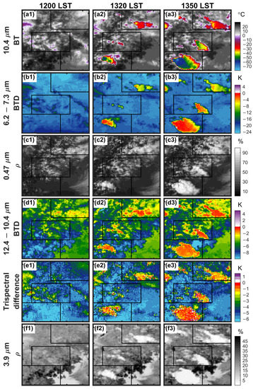 Images of Himawari-8 interest fields analyzed in this study at (a1–f1) 1200, (a2–f2) 1320, and (a3–f3) 1350 LST, including the (a1–a3) 10.4 μm brightness temperature (BT), (b1–b3) BT difference (BTD) between 6.2 and 7.3 μm, (c1–c3) 0.47 μm reflectance (ρ), (d1–d3) BTD between 12.4 and 10.4 μm, (e1–e3) trispectral difference, and (f1–f3) 3.9 μm ρ. Three convection-active zones are indicated by the black boxes.