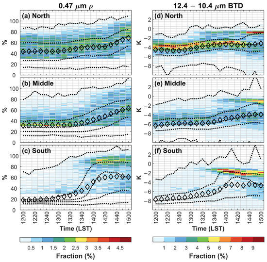As in Figure 12 but for the (a–c) 0.47 μm reflectance (ρ) and (d–f) brightness temperature difference (BTD) between 12.4 and 10.4 μm to describe cloud optical thickness.