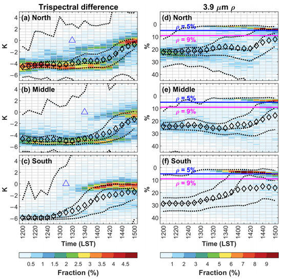 As in Figure 12 but for the (a–c) trispectral difference to describe cloud-top glaciation and (d–f) 3.9 μm reflectance (ρ) to describe cloud-top glaciation and particle size. Note that the vertical axis is reversed in (d–f). The blue triangles in (a–c) represent the first times when the fractions of cloudy pixels with positive values were larger than 1%.
