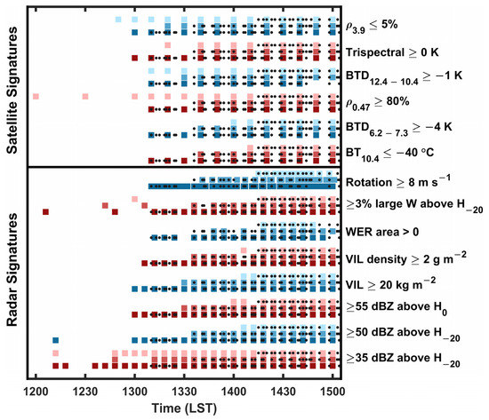 Temporal collocations between hail occurrence (indicated by the TBSS signature; black dots) and 14 radar- or satellite-derived signatures (shown on the right-hand side) for three convection-active zones (north, middle, and south—from the top to bottom rows in each subset). See text for more interpretation.