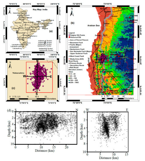 The seismicity data were considered in this study from the catalog of the National Centre for Seismology (NCS) [www.seismo.gov.in (accessed on 3 November 2021)] and published literature [45]. The observed earthquake epicenters were clustered along the national highway (NH-8) and its close adjoining areas especially located between Dahanu and Talasari geographic areas (Figure 2b). It is mentioned that the earthquakes catalog used in this study, compiled by NCS. The NCS is monitoring ongoing earthquake activities by a temporary seismological network established on 12 December 2018. NGRI, Hyderabad is also monitoring ongoing earthquake activities since 30 January 2019. Here, we have considered the earthquake M ≥ 1.2 from December 2018 to December 2020 in the present study, the activities are further being monitored. In the study area, the earthquake swarm (M ≤ 3.5) is located close to the Kurze reservoir and a few villages where people experienced the swarm activities over a long period. In addition, past earthquakes datasets from 1702 AD to 2005 [34,67,68] were also collected from the earthquake catalog (1200 AD to 2005) of published literature, and there only selective earthquakes (24 in total) were considered in the study area.