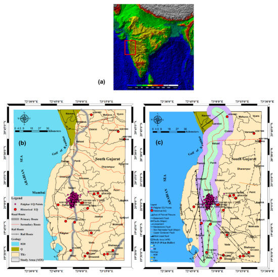 3D Terrain structure of the Indian shield, general geology and other geographical distribution of the study area; (a) 3D view of the terrain of the Indian shield areas (3D image using Land Viewer 2020); and red bounding box on this image shows broad regions of the study area applicable for Figure 2b,c. (b) General geology (masking from Geologic map of South Asia shapefile; https://certmapper.cr.usgs.gov/data/ accessed on 3 November 2020) [66] with other geographical information such as road and rail network distribution (masking from Geofabrik, OpenStreet Map data; http://download.geofabrik.de/asia.html (accessed on 3 November 2021)) [65] with recent Palghar earthquake swarm epicenters (3.5 ≤ ML) and historical earthquakes (5.7 ≤ ML) distribution since 1702–2005 (based on all available earthquake catalog, taken from 1200 AD to 2005) [34,67,68] where only 24 points (details of earthquake are given in Appendix A Table A1) are recorded within our AOI (red rectangle box); (c) Regional faults distribution in the western parts of India along with location of the observed earthquake swarms (distribution of earthquake epicenters during January and December 2020) and 10 km buffer zone created around highway NH-8 because recent earthquake swarms are clustered within buffer zone and along with historical earthquake points displaying over geology and regional faults.