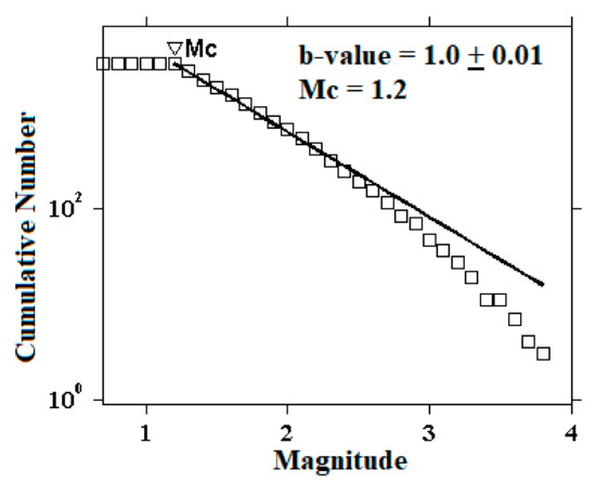 Therefore, accurate knowledge of Mc is essential for many seismicity-based studies, particularly seismicity parameters such as the b-value of the G-R relationship. As such, a large b-value indicates a high frequency of earthquakes with relatively small magnitudes of earthquakes. The estimated b-value is 1.00 ± 0.01 in this study, which indicates that the earthquake occurred due to active tectonics in the region.