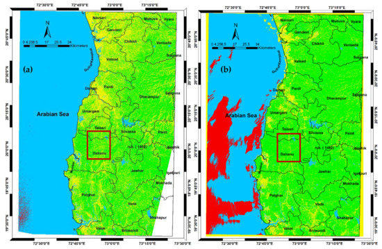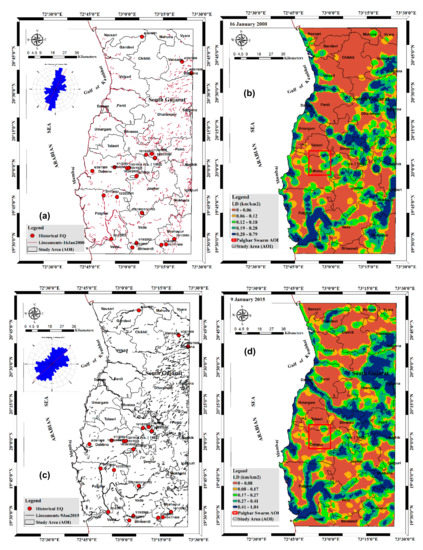 We also considered historical and reported earthquakes distributions from 1702 AD to 2005 for the analysis. The recent earthquake activities are considered in the lineament density red bounding box (similar to Figure 1b,c) with geographic co-ordinate extension 19.42°–20.93°N and 72.40°–73.25°E. Additionally, we also explored the changes in lineaments associated with the surface manifestations in the north Maharashtra area and its relations with the observed seismicity. The lineament data are mapped using multiple Landsat images for the entire areas in different time periods.