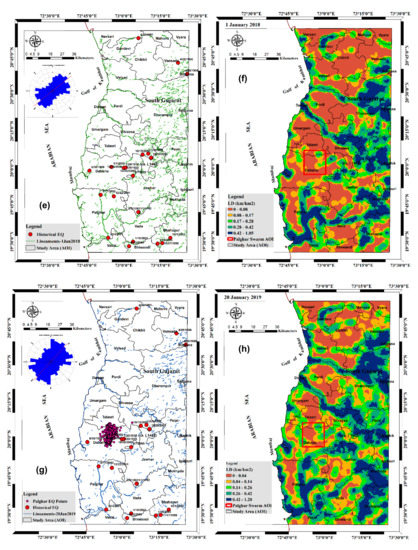 To continue with Palghar earthquake swarm activities, lineaments retrieved from the 1 January 2018 imagery (Figure 4e) show a similar trend to that in 2015, with the number of lineaments recorded at 1600 with an LDMax value of 1.05 km/km2 (Figure 4f). This indicates the presence of ongoing stresses in the broad regions including swarm regions which began in 2015 (9 January 2015 in our case) and the mean strike line (red color) position was in approximately NNE (N49°) to SSW (N229°) direction (average 2° forward rotating than 2015) along with medium-high stresses observed. The northern Maharashtra portion is a tectonically active region where we observed an increase in the lineaments up to 1600 in number on 1 January 2018 compared to 20 January 2019 (number of lineaments 961) (Figure 4g). Such changes in the number of lineaments are associated with the starting of earthquake swarms (Figure 4e), a sharp 1.72-fold decrease, with LDMax value of 1.20 km/km2 (Figure 4h) with mean strike line position was in approximately 47° NNE to 227° SSW direction (approximately 2° rotating back from the mean strike of 2018). During this time medium-high stresses were observed and change in stresses occurred as the lineaments dropped. Therefore, this could be occurred due to changes in surface deformation, and soil moisture content.