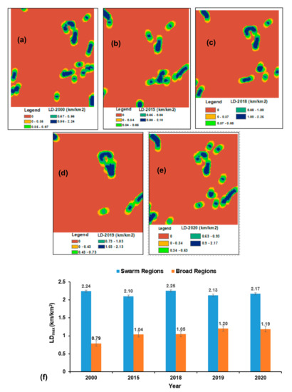 LD distribution of the swarm regions and its comparison with broad regions during 2000–2020; (a) LD distribution of 2000 of the swarm regions; (b) LD distribution of 2015 of the swarm regions; (c) LD distribution of 2018 of the swarm regions; (d) LD distribution of 2019 of the swarm regions; (e) LD distribution of 2020 of the swarm regions, and (f) LDmax value comparison in swarm regions with broad regions to know stress development pattern through the similar time interval. The error bar in both swarm and broad regions indicates the standard error of the mean data values.