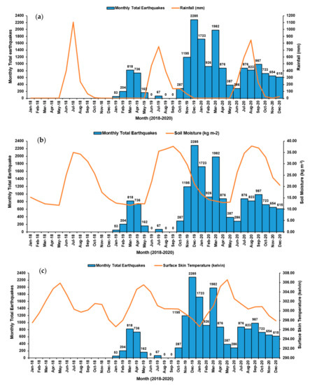 We have analyzed two meteorological and one geophysical parameter i.e., rainfall and monthly skin temperature, and soil moisture [86] to check whether these parameters have direct or indirect influences on the occurrences of earthquake swarm activity or not within the study region. The time-series area-averaged daily accumulated precipitation (combined microwave-IR) (GPM-3IMERGDE-V06) [86] with spatial resolution 0.10 was considered for monthly rainfall (mm) estimation. The monthly average surface skin temperature (unit: kelvin) with 0.5 × 0.625 degrees (MERRA–2 model M2TMN*SLV version 5.12.4) (Figure 8c) and monthly averaged time-series soil moisture content (unit: kg m−2) (0–10 cm underground) (GLDAS_NOAH025M v 2.1) model with 0.25° spatial resolution (Figure 8b) were saved in the similar time domain for the comparative analysis and its association with monthly total earthquakes of the earthquake swarm areas.