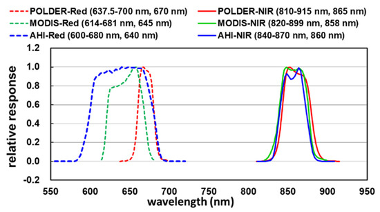 In this study, BRDF information that was retrieved from the AHI was compared with those of POLDER and MODIS in the red and near-infrared (NIR) bands. The relative spectral responses for POLDER [20], MODIS [22], and AHI [32] in the two bands are shown in Figure 1, and extremely similar responses in the NIR band can be observed. In the red band, the band range of AHI covers that of POLDER and MODIS, and the central wavelengths for AHI and MODIS are very close. These similar spectral responses for the three sensors indicate the data comparability in the two bands.