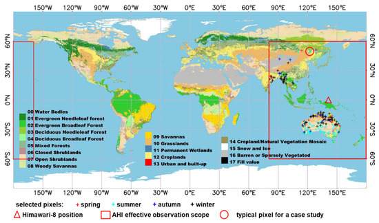 After performing quality control by removing data with a large solar zenith angle (SZA) (i.e., >85°), cloud cover, and poor aerosol optical depth (AOD), there were 213 sets of monthly accumulated AHI datasets in total among the 361 sets. After 6S atmospheric correction [43] to obtain the AHI surface reflectances from these top of atmosphere (TOA) observations, 198 sets of monthly accumulated data with reasonable surface reflectances (i.e., >0) for the two bands remained. For MODIS CMG, all 361 pixels can collect effective monthly multiangle data. The overlapping data for AHI and MODIS CMG were used for analysis which included 198 sets of data in total, as shown in Figure 2 and Table 1. According to Figure 2, these selected pixels are spread over the effective observation scope of the AHI (−60°S~60°N, 80°E~160°W, red rectangle in Figure 2), except in the western hemisphere. From Table 1, we can see that these selected high-quality AHI data come from various land cover types that are based on the MODIS IGBP classification product over four actual seasons in both the northern and southern hemispheres. Specifically, a vegetation pixel in a mixed forest area of northeast China (48.81°N, 122.94°E) during the summer was selected for the case study (red circle in Figure 2).