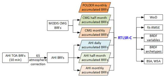 The flowchart of the evaluation of BRDF information for time-series AHI data is shown in Figure 4, including ~6.2 km POLDER, 0.05° MODIS CMG, and 0.05° AHI monthly collected multiangle data at 198 pixels, as shown in Figure 2. As reference data with high-quality angle sampling, the POLDER dataset contains the monthly accumulated bidirectional reflectances, which are also simply called bidirectional reflectance factors (BRFs) [20]. Then, the MODIS data that are spatiotemporally synchronous with the AHI data were also collected for a whole month that is same as POLDER, which were also accumulated for half a month considering the 16-day collections in the MODIS BRDF parameter product [22,23]. For the AHI, the monthly collected dataset was divided into three accumulation spans: a day, half a month, and a month. Before applying AHI data, the AHI TOA reflectances were processed into surface values using the 6S atmospheric correction model by inputting the corresponding AOD data as introduced in Section 2.2.