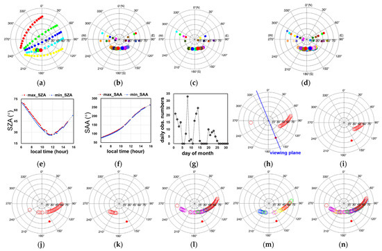 Statistics and distribution of the monthly accumulative sun-viewing angles for POLDER, MODIS, and AHI at a mixed forest pixel. The larger circles refer to the solar angles and the smaller circles refer to the viewing geometries. (a) refers to the angle distribution of POLDER in August 2008 and the colours indicate the different solar angles. (b–d) refer to the accumulated angles for MODIS for the first half of the month, the second half of the month, and the whole month in July 2020, respectively; the colours indicate the different solar angles. (e,f) present the ranges of SZA and SAA during July 2020. (g) presents the number of AHI observations for each day in July 2020. (h–k) refer to the accumulated angles for the AHI on four typical days, 1 July, 3 July, 14 July, and 22 July 2020, respectively. (l–n) refer to the accumulated angles for the AHI for the first half of the month, the second half of the month, and the whole month in July 2020, respectively, and the colours indicate the different observation dates.