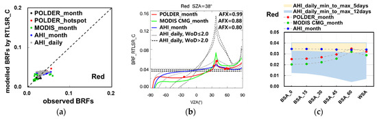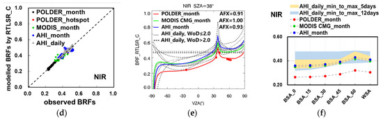 In the principal plane [Figure 6b,e], only the POLDER data have captured hotspot observations at two angles with VZAs (i.e., 33.9° and 40.3°) close to the SZA of 38° as well as small RAAs, while there are no data among the high-quality monthly accumulations for MODIS and AHI. The BRDF shapes that were retrieved from the monthly data of the three sensors are similar to the AFXs, and the results of concurrent MODIS and AHI data in July 2020 show a high consistency in the NIR band. The modelled BRDF shapes from the daily accumulated AHI data with large WoDs (i.e., >2.0) are shown as black dashed lines, and some of them present an obvious difference from the results of the monthly accumulations, especially in the red band. Therefore, the accumulated AHI multiangle data that gain large WoDs are not recommended for further use following quality control of the MODIS BRDF parameter product [7]. In addition, in the Ross-Li model inversion from the AHI multiangle observations, some inverted kernel coefficients only contained anisotropic scattering, while the results for volumetric and geometric-optical scattering are zero. This situation occurs more frequently in the red band (eight days) than in the NIR band (three days) among all 12 days, which leads to constant bidirectional reflectance fittings that are generally close to the results from the monthly data (i.e., blue lines).