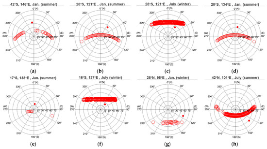 The typical angle distribution among 126 sets of high-quality monthly AHI data with a WoD that is less than 2.0 is shown in Figure 7, which is associated with the accumulated AHI data in the summer and winter along with several sets of latitude and longitude. Considering the data integrity in collecting a relatively complete change in the angle distribution of the AHI during a month, several sets of data that were affected by fewer disturbances of undesirable atmospheric conditions were selected and used to investigate the typical characteristics of AHI angle variances. Figure 7a–f refers to the results in the southern hemisphere, and Figure 7g–h shows those in the north, which present the pattern of solar angles [31,34] and viewing angles along with the seasons and locations.