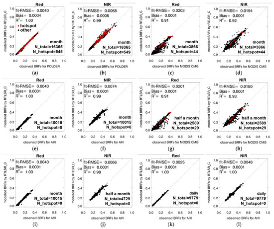 Comparisons of reflectances between the observed and RTLSR_C-fitted values from AHI- and MODIS CMG-accumulated observations during a whole month, half a month, and a day. The red dots represent data near the hotspot direction, and the black dots are data at the remaining geometries. The sensors, bands, and time spans are labelled in each plot. (a–f) refer to the results at the month scale for the three sensors in the red and NIR bands, and (g–j) refer to those for AHI and MODIS at the half-month scale. (k,l) refer to the results for AHI at daily scale.