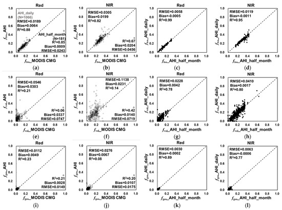 Comparisons of BRDF parameters that were retrieved from AHI- and MODIS CMG-accumulated observations during a day and half a month. (a) refers to comparisons of fiso that was retrieved from half-month (black circle) and daily (grey dot) AHI data with those from half-month MODIS data in the red band, and (b) is similar to (a) but in the NIR band. (c,d) refer to comparisons of fiso that were retrieved from the AHI data between the half-month scale and daily scale in the red and NIR bands, respectively. (e–h) refer to the results similar to (a–d) but for fvol, and (i–l) are those for fgeo.