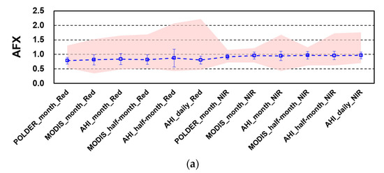 The statistics of the AFXs that were retrieved from these high-quality multiangle data of the three sensors are listed in Table 7, and Figure 10 presents the results comparison for these AFXs. Compared with POLDER, MODIS and AHI can obtain a wider number of changes in AFXs, especially for the AHI that attains the largest standard deviations from Table 7 and Figure 10a. The average AFXs for the AHI at the three time scales are highly consistent and close to the results of MODIS and POLDER. Similar to the comparisons of the three kernel coefficients in Figure 9, the results with regard to the AFX also show a better consistency in different time spans of the AHI than those from the AHI and MODIS. Specifically, the RMSEs of the half-month data between MODIS and AHI are 0.32 and 0.15 with small biases in the red and NIR bands, respectively, and the results between the daily and half-month AHI data are 0.07 and 0.05, respectively. As a composite index of the three kernel coefficients to describe the dominant scattering type, the overall agreement in the AFX between MODIS and AHI, in addition to some discrepancies, shows the BRDF similarity in the two sensors, which is attributed to similar angle patterns. Notably, the good consistency in these AHI AFXs between the daily and half-month scales also indicates subsequently similar BRDF information.