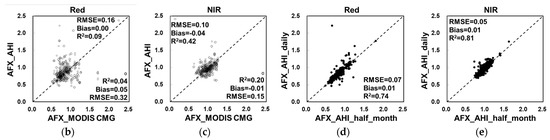 Comparison of AFXs that were retrieved from the accumulated observations of POLDER, MODIS CMG, and AHI during a day and half a month. (a) refers to the variance ranges of AFX that were retrieved from accumulated multiangle observations of the three sensors at different time spans. (b) refers to comparisons of AFX that were retrieved from half-month (black circle) and daily (grey dot) AHI data with those from half-month MODIS data in the red band, and (c) is similar to (b) but in the NIR band. (d,e) refers to comparisons of AFX that were retrieved from AHI data between the half-month scale and daily scale in the red and NIR bands, respectively.