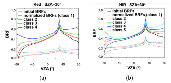 In addition, several BRDF archetypes for daily accumulated AHI data were extracted by classifying their AFXs using an iterative self-organizing data analysis technique algorithm (ISODATA) [24]. The fit-RMSEs between multiangle reflectances that were modelled by each set of BRDF parameters and their average for each AFX class were counted, and the optimal classification number was determined when the fit-RMSEs decreased to 80% compared to the errors of non-classification. Consequently, the average BRDF parameters for each AFX class were called BRDF archetypes, which represent the dominant BRDF shapes and can usually capture ~90% of the total variance in these AHI BRDF data.