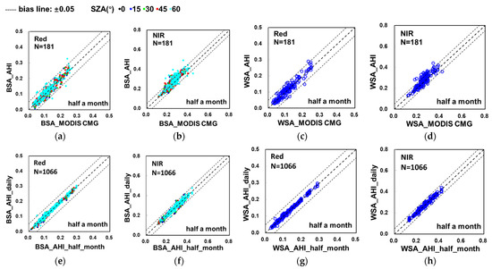 Finally, BSA and WSA can be calculated by integrating the simulated bi-directional reflectances over the viewing radiation hemisphere and over both the viewing and incident radiation hemispheres, respectively [23]. Formulas of BSA, WSA, and AFX are shown in Equations (A10)–(A12) in Appendix A. Similar to the BRDF analysis, the difference in albedos between AHI and MODIS as well as AHI data at different accumulation spans were examined, and statistical parameters of RMSE, Bias, and R2 are shown in Equations (A13)–(A15).